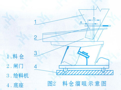 (3)料仓开口尺寸应能保证获得足够的料层厚度。同时为了调节料层厚度应设置闸门。料仓配置型式参看图2,一般情况下,a与b的比值为1/4左右。