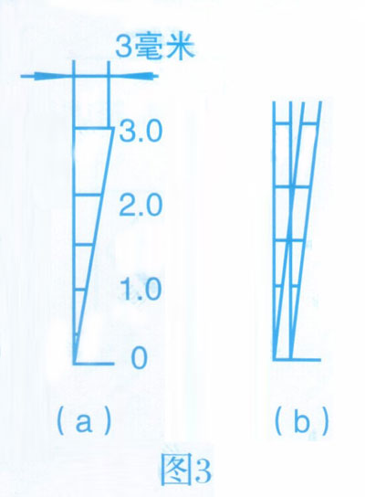 (1)振幅的测量振幅指示牌如图3(a)所示,只是部分为一直角三角形。当指示牌与槽体一起振动是,由于视觉暂留,直角边与斜边形成一个交点,其交点所对应的标尺数即为被测槽体的双振幅。当双振幅为2毫米时,交点就对应在标尺2处,如图3 (b)所示。