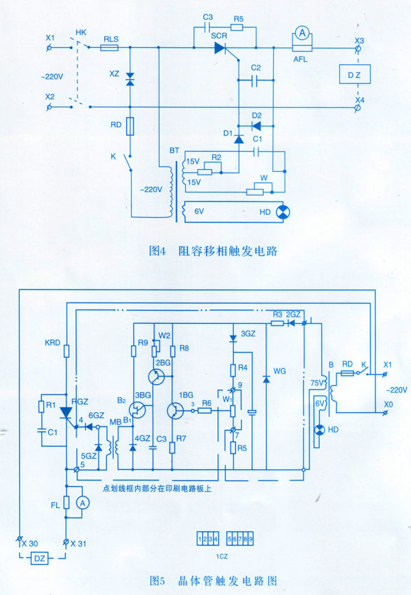 图4所示为阻容移相角拨电路原理图,图5所示为晶体管触发电路原理。其它如需各种 形式的自动控制电控箱,可按要求制作。七、随机技术文件